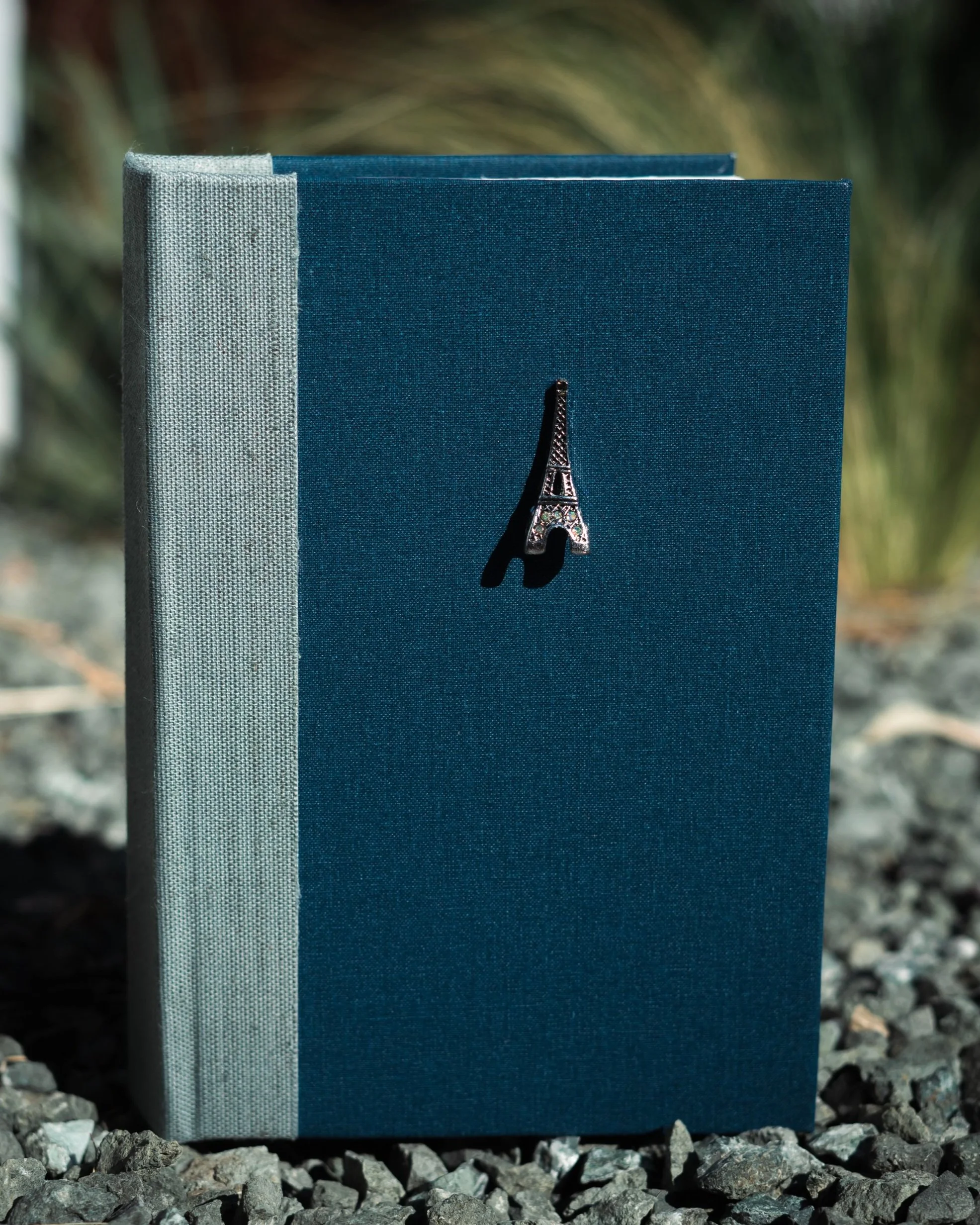 The charm on the front cover was sanded down in order to stabilize and lay flat. The Eiffel Tower represents Paris—the primary setting of the book.